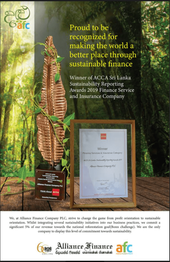 அலையன்ஸ் ஃபைனான்ஸ் கம்பெனி பிஎல்சி (AFC) இலங்கையின் இரண்டாவது பழமையான நிதி நிறுவனமாகும். இதன் வணிகத் தத்துவம், உள்ளூர் மற்றும் சர்வதேச நிலையான அபிவிருத்தி முன்னுரிமைகளைப் பூர்த்தி செய்வதோடு, மக்கள், பூமி மற்றும் இலாபம் ஆகியவற்றை மையமாகக் கொண்ட மும்முனை அடிப்படைக் கொள்கைகளால் வழிநடத்தப்படுகிறது. AFC, நம்பிக்கையின் உறுதியான அடித்தளத்தில் கட்டப்பட்டுள்ளதுடன், கடந்த அறுபது ஆண்டுகளுக்கும் மேலாக இலங்கையில் அறநெறி சார்ந்த வணிக நடைமுறைகளில் களங்கமற்ற சாதனையையும் கொண்டுள்ளது.
